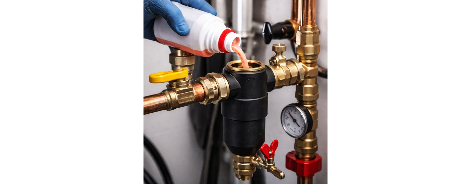 Spolning av värmeinstallationen med kemiskt medel via smutsavskiljare