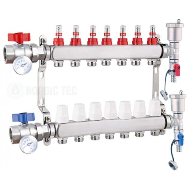 Om du behöver en fördelare för 7 värmekretsar - kolla även in våra andra erbjudanden från Nordic Tec:s produktserie. Dessa kan innehålla något annat utrustningspaket eller skilja sig i material (i vårt sortiment hittar du fördelare i stål samt varianter i mässing med en robustare konstruktion).