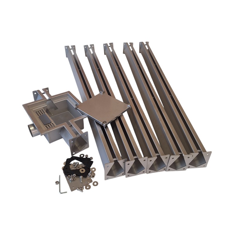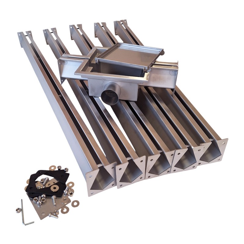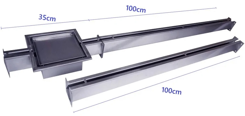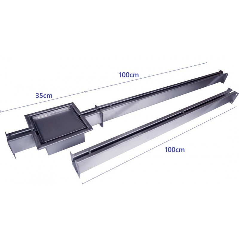 Varje sats med industriell golvbrunn – linjeavvattning i detta erbjudande innehåller ett avloppsgaller, det vill säga den grundläggande komponenten. Tillsammans med anslutningarna för armkanalerna – alltså vattenuppsamlingskanalerna – är den 35 cm lång. Detta bör beaktas vid planering av köp och installation. Det är en avloppsdel som ansluts till avloppssystemet och har ett utlopp i storlek DN50, vilket är synligt på bilderna.