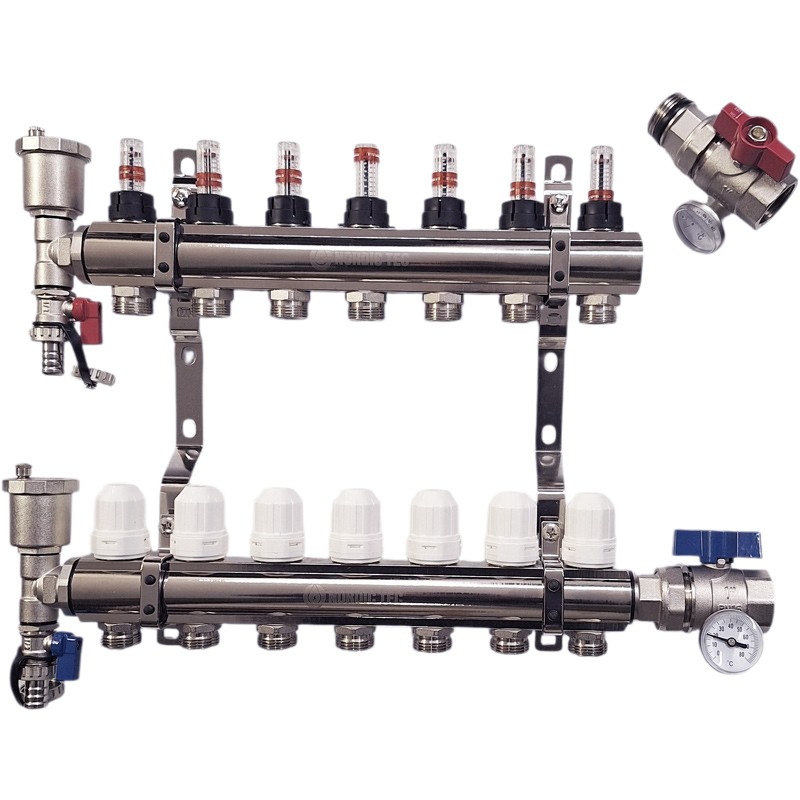 Golvvärmefördelare med 7 kretsar, komplett utrustad med alla nödvändiga delar och tillbehör för att ansluta 7 sektioner av det centrala värmesystemet. Allt i ett paket, utan behov av att leta efter eller köpa ytterligare komponenter separat. Detta innebär både tids- och kostnadsbesparingar: 7-kretsfördelaren levereras redan monterad med flödesmätare och ventiler. Det enda som behövs är att bestämma vilken sida av fördelaren som ska ha avstängningsventiler och termometrar för golvvärmen, och vilken sida som ska ha avluftningsventiler, och därefter skruva fast dem. Monteringen av hela kitet tar bara några minuter.
