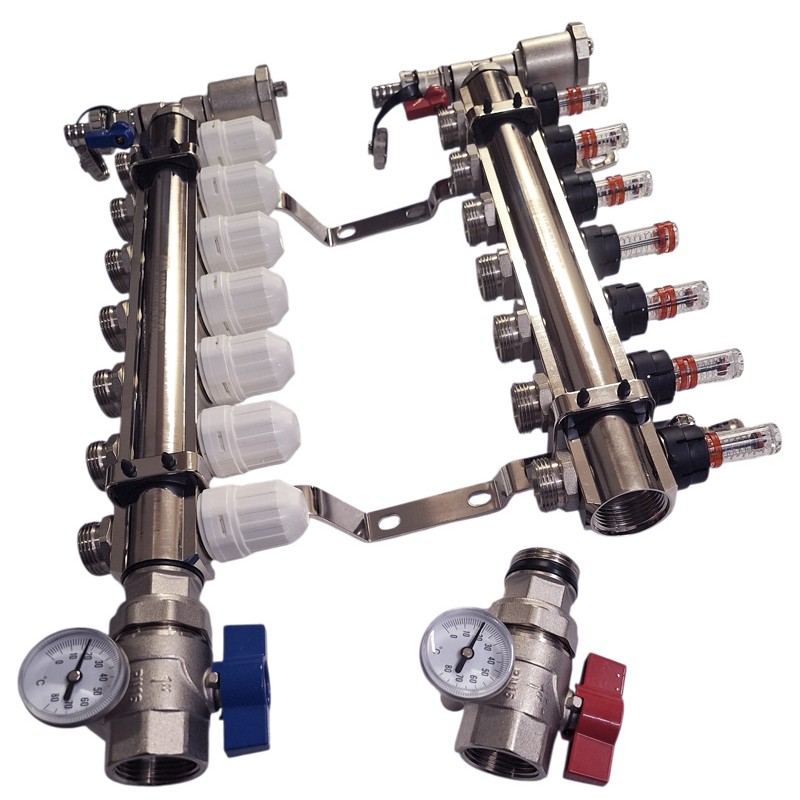 Komplett fördelare för ett golvvärmesystem med 7 kretsar, även användbar i klassiska lösningar med radiatorer.
