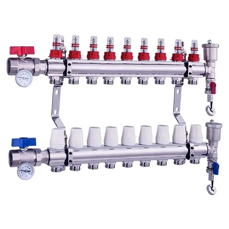 Fördelare för golvvärme med 9 uttag – klassisk, fullt utrustad fördelare, inklusive ventiler med temperaturmätning för tillopps- och returvatten.