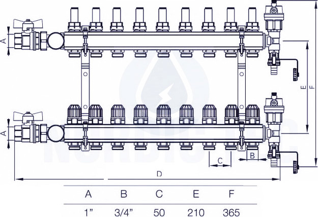 Nordic Tec Golvvärmefördelare 9 kretsar med ventiler och 2 termometrar