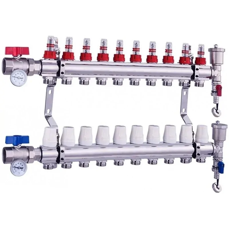 Golvvärmefördelaren med 10 kretsar, liksom andra modeller, är tillverkad i mässing med krombeläggning – en förbättrad ekonomisk version jämfört med standardmodeller utan krombeläggning.