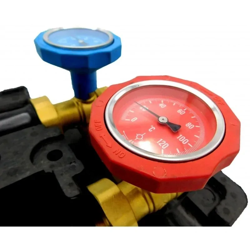 - Med två termometrar, för framledning och retur, i intuitivt valda färger för varmt och kallt medium