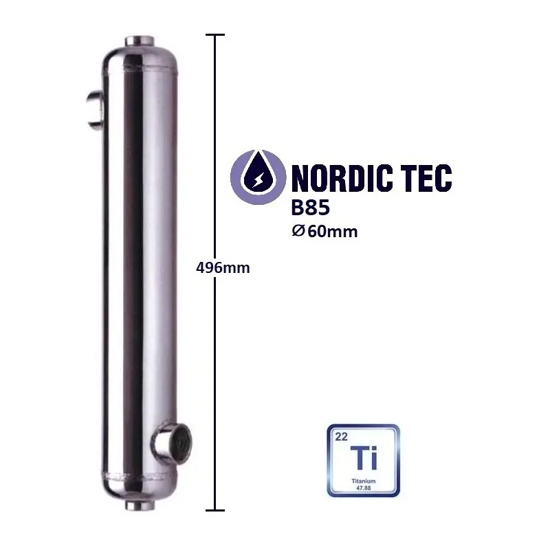 Värmväxlare för pool i titan B85-Ti - En enhet tillverkad till 100 % av rent titan utan föroreningar, som främst används för uppvärmning av pooler med havsvatten, saltvatten eller brackvatten. Ytterligare tillämpningar finns inom industrin med aggressiva medier som är för krävande för billigare värmväxlare i stål.