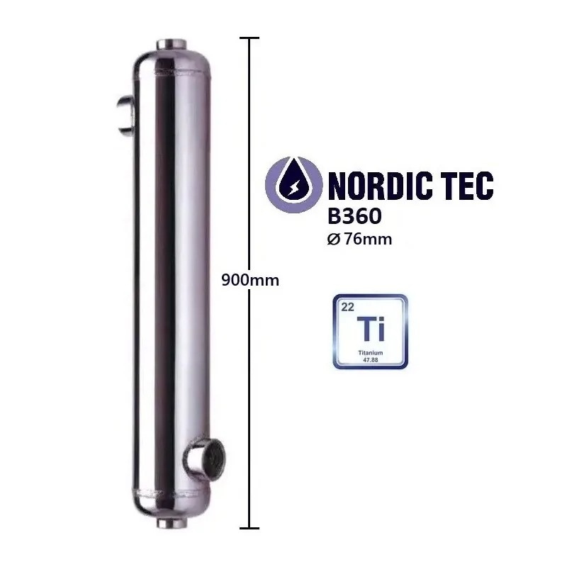Värmväxlare B360-Ti, liksom andra modeller i Nordic Tec-serien -Ti, är helt tillverkade av titan. Detta är rent titan utan tillsatser av andra material. Detta material har använts för både rör och mantel på enheten, samt för anslutningarna.