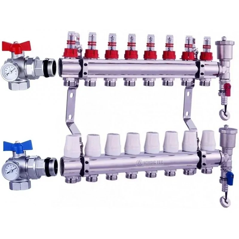 Värmefördelare med 8 slingor - Nordic Tec för 8 golvvärmekretsar, fullt utrustad