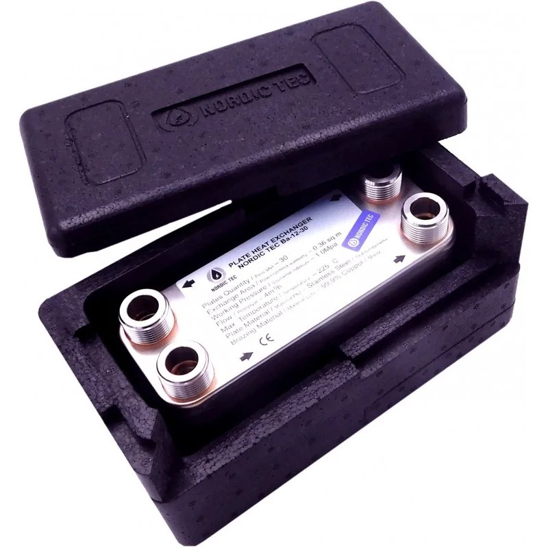 Värmeväxlare med 30 plattor och en plattarea på 0,36 m² samt en nominell effekt på 65 kW (vid höga tillförselparametrar). Plattvärmeväxlaren Ba-12-30 med 30 plattor är lämplig för anslutning av små värmeanläggningar till ett värmesystem, för att koppla små slutna och öppna system. Värmeväxlaren Nordic Tec Ba-12-30 finns tillgänglig (valfritt) med termisk isolering och väggfäste (monteringssats) – tillbehörsval för växlaren finns i menyn ovanför priset.