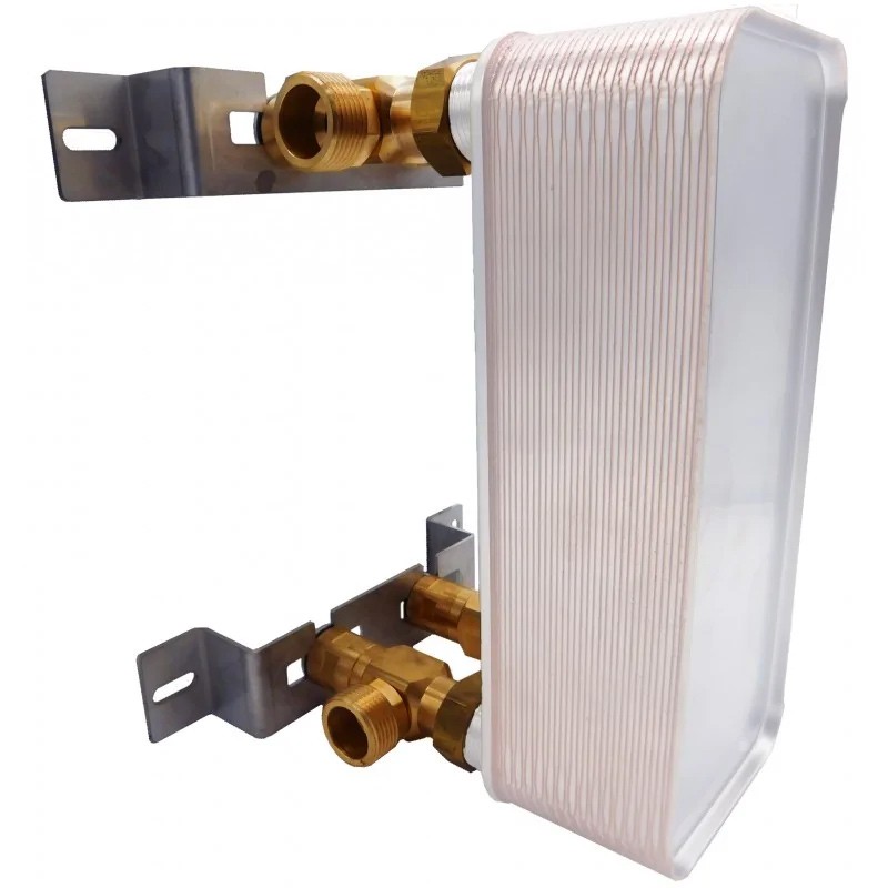 Rostfri stål värmeväxlare med 22 plattor och en nominell effekt på upp till 100 kW (höga parametrar) och en 1"-anslutning.