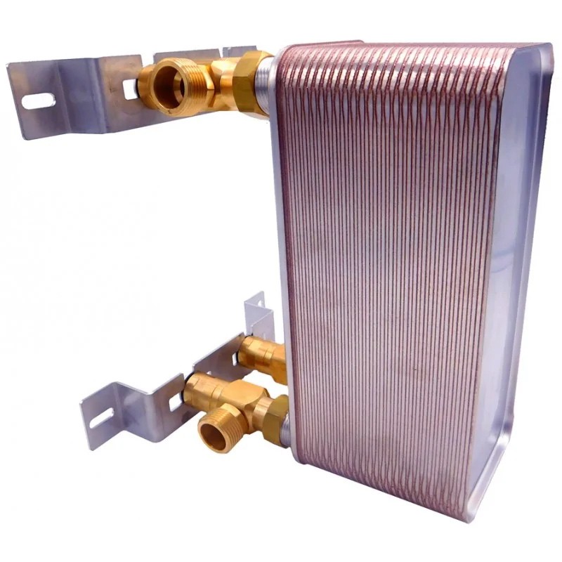Värmeväxlare 70-plattig, lödd vätska-vätska, skapad främst för värmesystem – exempelvis för att koppla samman öppna och slutna system. Värmeväxlaren är 70-plattig och kan samarbeta med nästan alla värmekällor – eldstäder med vattenmantel, vedpannor, kol, trä, pellets – biomassa osv.