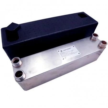 Nordic Tec erbjuder som tillval en värmeisolering för värmeväxlaren, med en tjocklek på cirka 24 mm, tillverkad av polypropenskum. Denna modell har 6/4-tums anslutningar, vilket möjliggör ett högt flöde. Den nominella flödeskapaciteten för värmeväxlaren är 22 m³/h, men det är viktigt att notera att ett rör på 1 1/2" möjliggör ett maximalt flöde på cirka 15,50 m³/h.