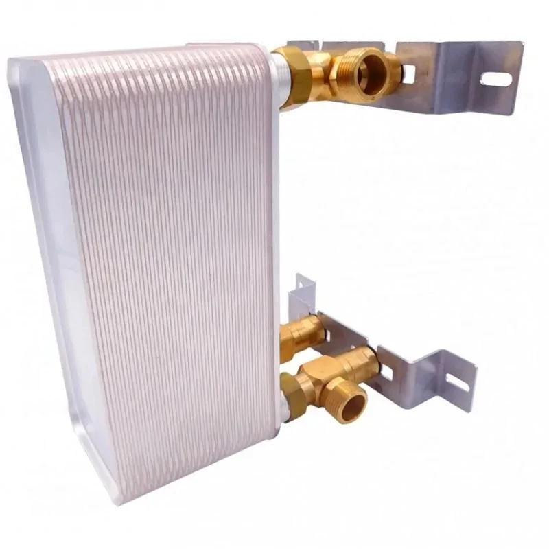 Den värmeväxlande ytan är den viktigaste faktorn och det enda objektiva kriteriet som avgör effektiviteten hos en plattvärmeväxlare. Den ovan beskrivna modellen är utrustad med 40 rostfria stålplattor, var och en med en yta på 0,60 m². Tillsammans utgör de en total yta på 2,40 m². Denna yta möjliggör anslutning till många modeller av värmepumpar, särskilt när de behöver kopplas till centralvärmesystem (till exempel i en glykol/vatten- eller vatten/vattenkrets). Om du behöver en värmeväxlare med större yta, hittar du andra modeller i Ba-60-serien i bilden ovan, även tillgängliga i vår butik.