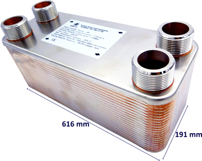 - Värmeväxlare tillverkad av rostfritt stål 316L, lödd med 99,9 % koppar (Cu)