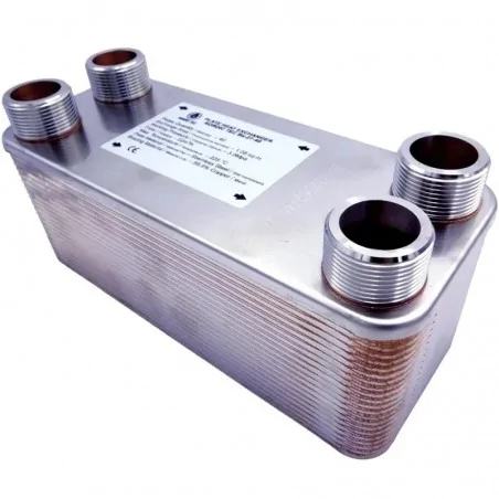 Lödad plattvärmeväxlare med 2-tums anslutningar och 50 plattor i stål. Används ofta för att ansluta värmepumpar och andra värmeanordningar till värmesystem.