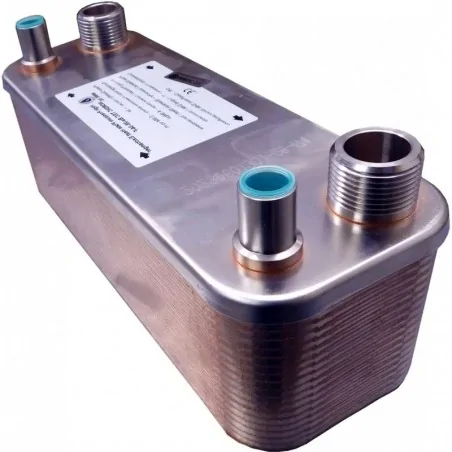 Freon-värmeväxlare för gasformiga vätskor, med 60 plattor och högtrycksdesign (max 45 bar), för applikationer med vätskor (mottagarsida - första kanalen) och köldmedium/gasformig vätska (motsatt sida). Värmeväxlaren kan fungera som kondensor/förångare för värmepumpar eller luftkonditioneringssystem som modifierats för att användas som hushållsvärmepumpar. Freon-värmeväxlaren är idealisk för köldmedier i tillämpningar som inte överstiger 45 bar | 4,5 MPa.